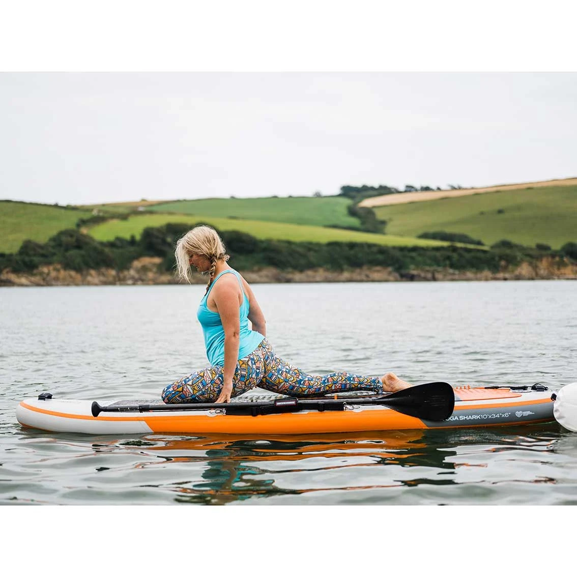 Designed for those that want a SUP yoga board, the Shark 10′ x 34″x 6″ creates a high level of stability and buoyancy needed for fitness. The shark yoga share’s the same well proven attributes of the allround boards, whilst creating more stability from the width and higher volume as well as offering well-placed handles and paddle holder for use whilst exercising, a comfortable EVA deck pad with well placed and a carry strap for ease of getting the board to the waters edge.
