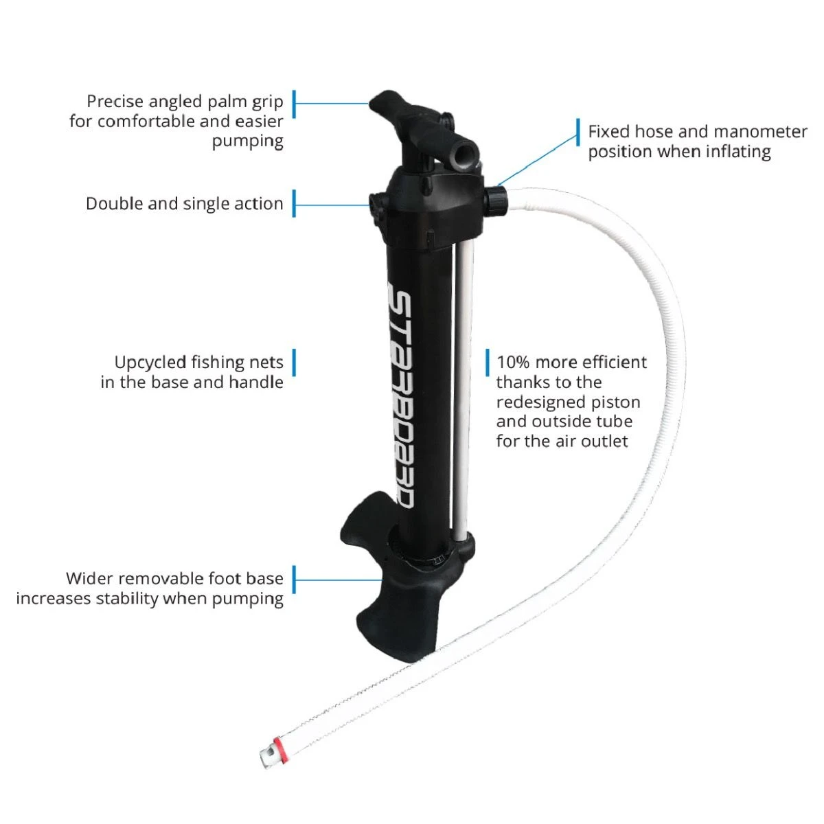 • Fixed hose and manometer position when inflating.• 10% more efficient thanks to the redesigned piston and outside tube for the air outlet. Plus, double and single action pumping modes and wider removable foot base that increases stability when pumping.• The base and handle are made from upcycled fishing nets.