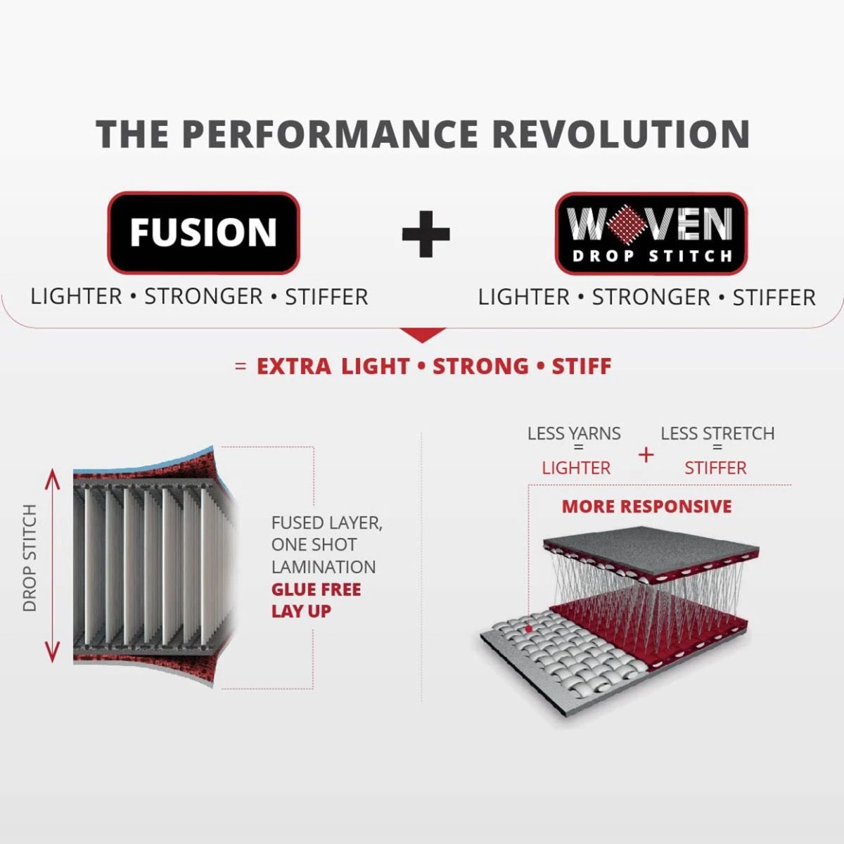 WEAVE DROPSTITCH Made from a market-leading machine weave double laminated dropstitch, 20% lighter and stiffer than fusion layer boards. The weave has less give than the traditional knitted method, which gives superior flex and rigidity, with no compromise on durability.